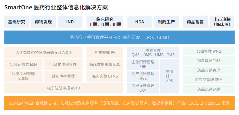 我們?yōu)槿虻纳镝t(yī)藥公司提供醫(yī)藥行業(yè)從研發(fā)到生產(chǎn)的整體信息化解決方案,基于公司自主研發(fā)產(chǎn)品“一智通SmartOne”。幫助生物醫(yī)藥公司實(shí)現(xiàn)數(shù)字化轉(zhuǎn)型,降低成本、保障品質(zhì)、提高效率。